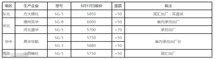 表6 5月17日国内PVC出厂价格调整(单位:元/吨)