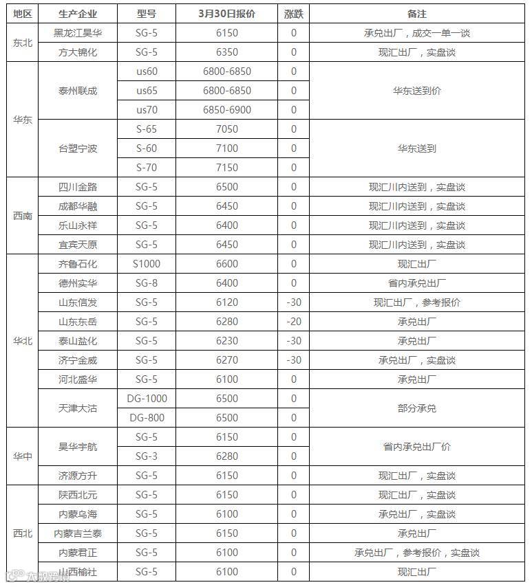 表6 3月30日国内PVC出厂价格调整(单位:元/吨)