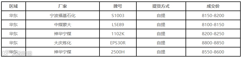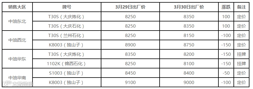 表5 3月30日国内PP出厂价格调整(单位:元/吨)