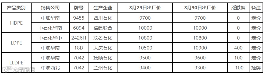 表4 3月30日国内PE出厂价格调整(单位:元/吨)