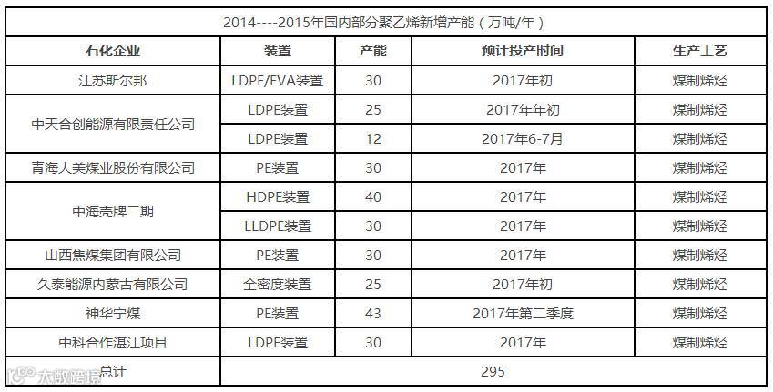 上表为2017年新增产能统计表。截止到2016年底目前国内聚乙烯产能已经达到1585.8万吨,其中煤制聚乙烯装置产能在273万吨,而2017年计划投产的295万吨皆为煤制聚乙烯装置,预计到2017年末期将达到1880.8万吨左右。我国通用料产能过剩问题将更加突出,届时聚乙烯市场白热化竞争将愈演愈烈。