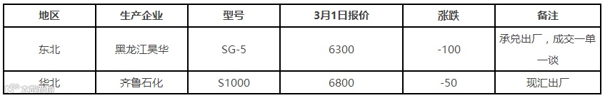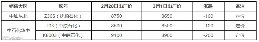 表5 3月1日国内PP出厂价格调整(单位:元/吨)