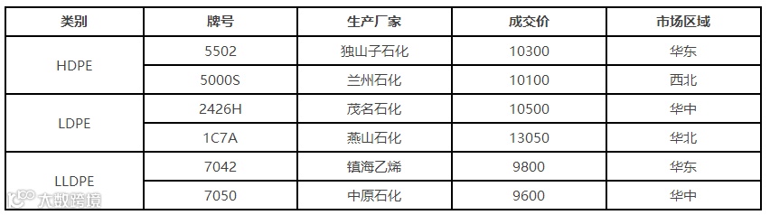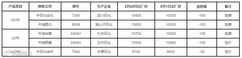 表4 3月1日国内PE出厂价格调整(单位:元/吨)