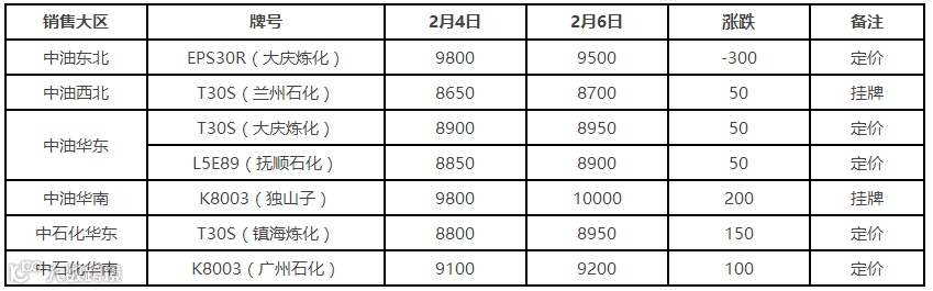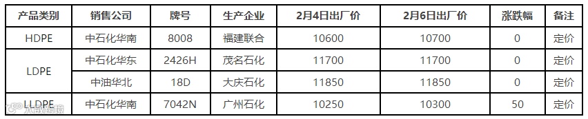 表4 2月6日国内PE出厂价格调整(单位:元/吨)