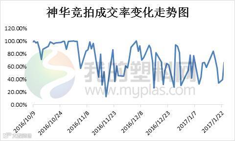 1月16日-1月22日国内神华系列竞拍平均成交率在16.67%,较上周大幅下滑,其中成交率峰值出现在1月17日,成交率在84.07%,原因是塑料期货价格上涨,提振现货市场交投气氛。谷值出现在1月20日,成交率跌至33.97%,原因是节前业者多数开始放假,商家备货减少,导致神华竞拍下滑明显。