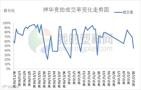 本周国内神华系列PP竞拍平均成交率在71.19%。其中成交率峰值出现在2月6日,成交率在85.87%,主因PP期货盘中大举拉升,刺激买盘入市积极性,场内成交一度向好。谷值出现在2月10日,成交率在45.27%,主因PP期货盘中跌破9200元/吨关口,且临近周末场内观望情绪激增,市场成交不足。