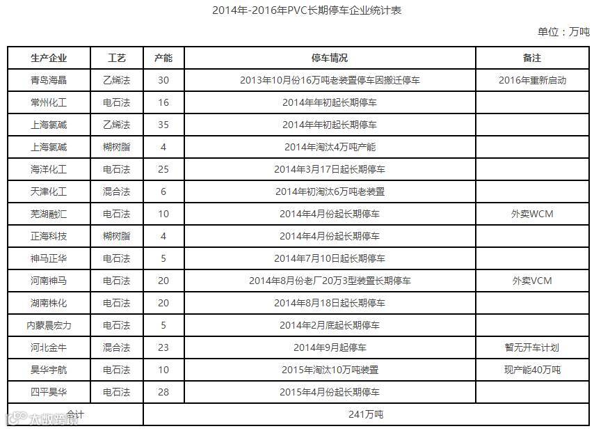 另外国内还有相当一部分长期停车PVC装置,多分布在华北、华中和华东地区,当地虽毗邻消费地区,但市场同质化竞争严重,且多数退出企业需要外购原料,缺乏一体化循环项目,在未有新的有竞争力的产品下,连续亏损之下,只有被动选择停车或退出。