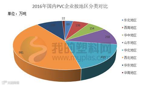 在地区产能分布中,2015年西北6省份的聚氯乙烯产能已经占到了总产能43.54%的份额,且全部为电石法工艺。西北地区是我国最主要的电石生产区域,其电石产量占国内电石总产量的80%以上,广大的西部地区依托本地资源优势,大力发展“煤-电-PVC”一体化循环经济项目,成为近几年国内PVC工业发展的显著特点。
