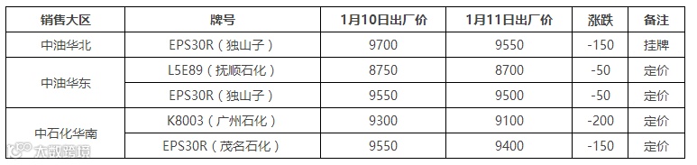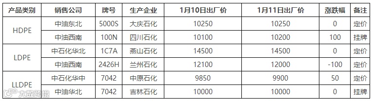 表4 1月11日国内PE出厂价格调整(单位:元/吨)