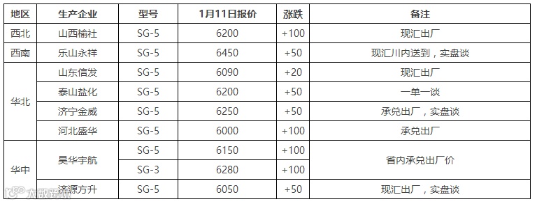 表6 1月11日国内PVC出厂价格调整(单位:元/吨)