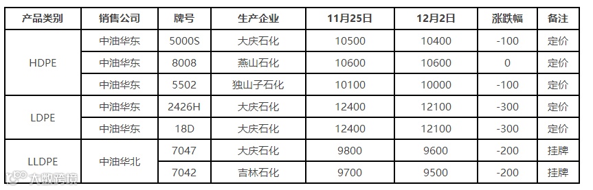 表1 本周国内PE出厂价格调整(单位:元/吨)