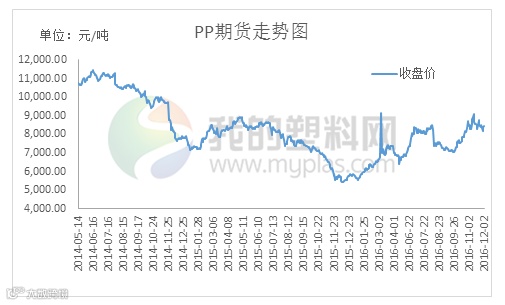 本周国内PP主力1705震荡整理。具体来看,周初开盘价在8250元/吨,周五收盘8498元/吨,最高8590元/吨,最低8058元/吨,周涨208元/吨或2.51% 。成交量增加至363040手,持仓量增加62460至366328手。