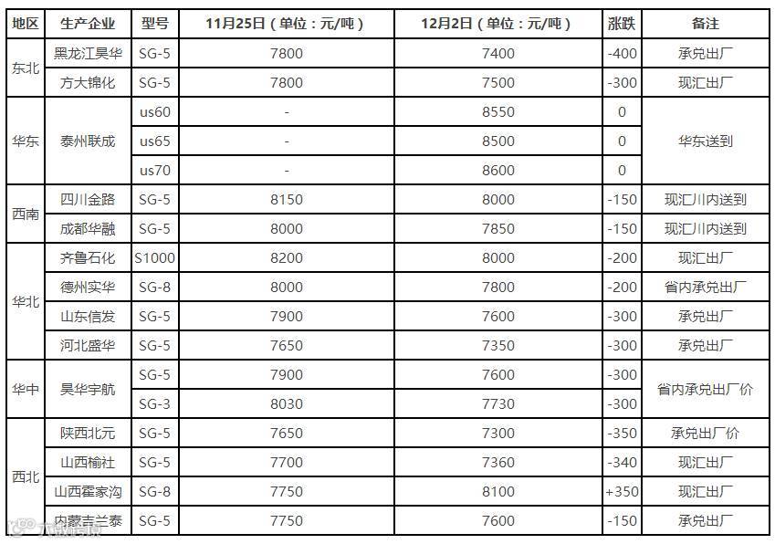 截至本周末,华北地区山东信发SG-5厂提报7700元/吨,较上周五跌110元/吨;天湖SG-5厂提报7200元/吨,较上周五跌300元/吨;广州大沽1000库提报8200元/吨,较上周五跌270元/吨。