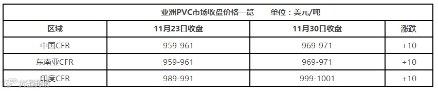 表5 亚洲PVC市场收盘价格表