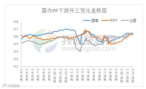 截止12月2日当周,国内聚丙烯下游行业开工率变化不大。其中塑编行业开工率在65%左右,共聚行业开工率在64%,BOPP行业开工率在63%左右。
