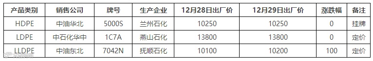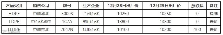 表4 12月29日国内PE出厂价格调整(单位:元/吨)