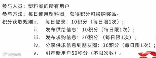 日常积分是最基本的赚取积分的方法。其他什么都不用做,坚持5天,10元红包(300积分)就到手了。如果在此期间,有朋友点开你的朋友圈分享链接,并由此进入塑料圈完成了注册,那么引荐数是算到你头上的,积分就哗哗地涨了。