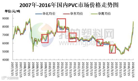 2016年国内PVC价格从1月份的4650-4850元/吨,涨到目前的7850-8550元/吨,涨幅已达72.6%。这波行情不仅PVC企业利润飙升,PVC贸易商更是赚的“盆满钵满”。而对下游塑料制品企业却是难言的煎熬。在PVC价格大步迈过8000元/吨的门槛后,市场仍未有止盈意向,在PVC连创新高的大行情下,PVC背后的风险不容忽视。