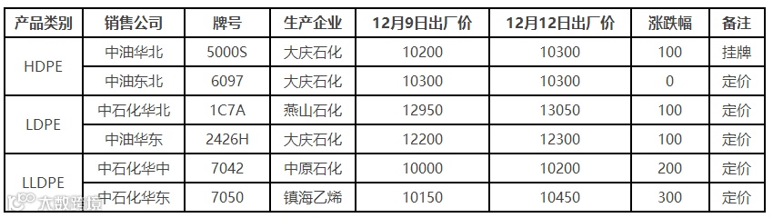 表4 12月12日国内PE出厂价格调整(单位:元/吨)