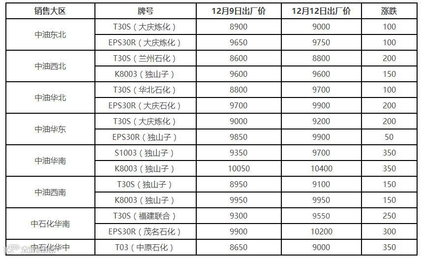 表5 12月12日国内PP出厂价格调整(单位:元/吨)