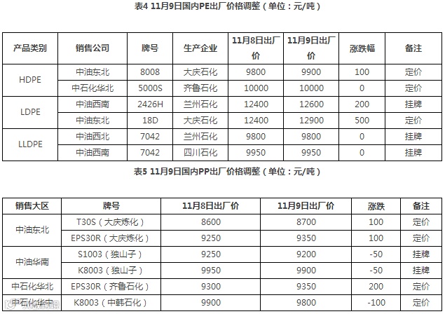 PE:今日国内PE市场价格涨跌互现,线性和低压石化出厂价较稳,中油西南和中油东北高压出厂价上调200-500元/吨,中石化华南高压出厂价下调100-200元/吨。线性期货高开震荡上行,提振市场,贸易商报盘窄幅调整为主,但高价成交有限,少数市场价格出现松动,终端刚需采购为主,补仓意识不强。