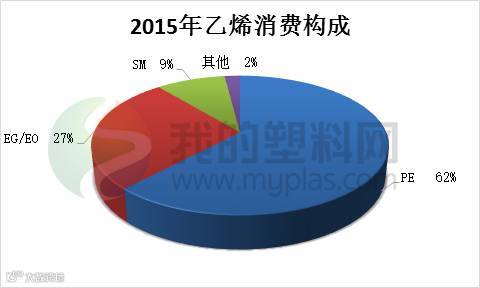 据我的塑料网统计,截止2015年底,我国乙烯行业产能达2200.5万吨,而我国乙烯单体贸易量预计仅为300-400万吨左右,如此大规模产能之下,微薄的市场交易量已经是成为全球行业的普遍问题。乙烯装置对原料自给和规模都具有极高的要求,整体技术工艺复杂,资金需求大,因此乙烯行业的进入壁垒较高,国有大型企业占据了较大的产能比重。无论是传统的油制路线生产企业,还是新兴的煤化工生产企业,其乙烯资源多数用于下游聚乙烯产品的生产,而其它占比较大的产品有乙二醇、环氧乙烷、苯乙烯等。