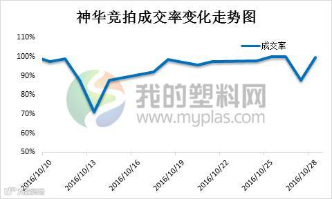 10月21日-10月28日国内神华系列竞拍平均成交率在97.06%,其中成交率峰值出现在10月25日,成交率高达99.89%。原因是石化频繁上调出厂价,对市场形成成本支撑,加之市场货源紧缺,商家纷纷跟涨出货,市场交投较火热。谷值出现在10月27日,成交率在87.6%,主因PE期货大幅下挫打压市场交投气氛所致。