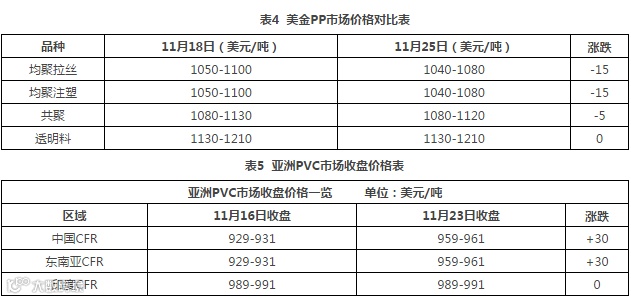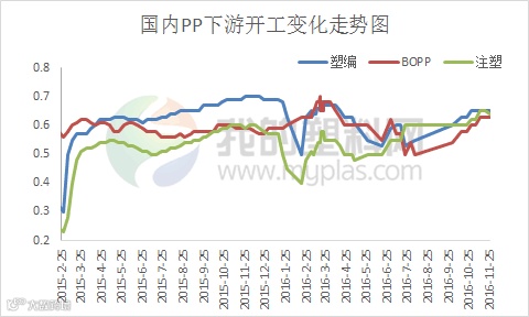 截止11月25日当周,国内聚丙烯下游行业开工率略有降低。其中塑编行业开工率在65%左右,共聚行业开工率在64%,BOPP行业开工率在63%左右。