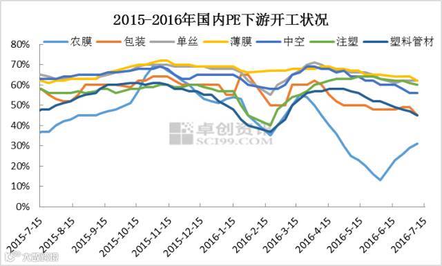 下游来看,本周国内PE下游行业除农膜与包装开工小幅增加,其他行业开工基本稳定。农膜因棚膜开工启动,加之原料价格本周频频下滑,部分逢低采购,开工积极性略有增加。包装行业同样受益于原料价格下滑,加之部分订单尚可,开工负荷小幅上升。单丝、薄膜、中空行业开工稳定,而管材行业淡季效应仍在,而原料价格相对高位,行业开工继续小幅下滑。