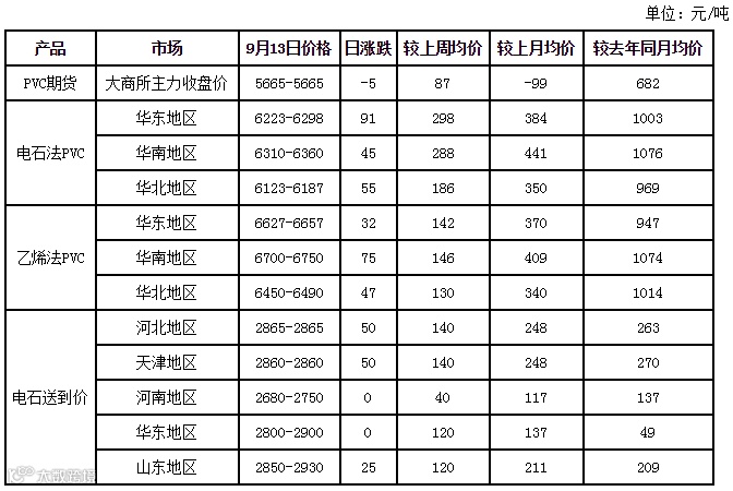 华东PVC市场报价继续上涨,且涨价明显。5型普通电石料,主流自提报价在6250-6300元/吨,低价难寻,略高报价也有。宜化、三联、盐湖等货源自提6230-6250元/吨,北元、君正等自提6300元/吨,天辰、天能自提6320-6350元/吨,高型号货源紧张价格高挺,比5型牌号货源报价高200元/吨。乙烯料货源依旧不多,报价上涨,1000型号送到华东报价在6650-6750元/吨。