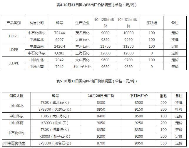 PE:今日国内PE市场价格小幅上涨,中石化出厂价格较稳定,中油华北低压和高压涨幅在100元/吨,线性小幅整理为主。早间石化厂家持续拉涨部分牌号出厂价,线性期货高开高走,提振市场,贸易商多随行跟涨报盘,现货市场成交尚可,终端按需采购,谨慎观望居多。