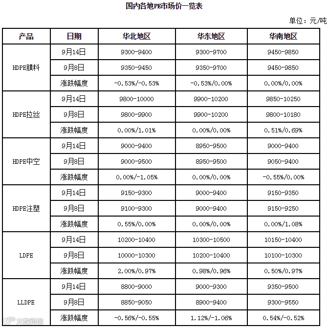 今日PE市场价格弱势震荡,华北和华东个别线性略低20-100元/吨,个别高压松动50元/吨,其他变动不大。部分石化下调出厂价,且临近假期,市场交投低迷,商家随行小幅让利。下游需求积极性不高,谨慎观望为主。华北地区LLDPE价格在8800-9000元/吨,华东地区LLDPE价格在9000-9300元/吨,华南地区LLDPE价格在9350-9500元/吨。