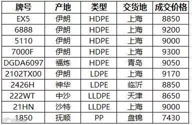 主流膜料成交在1125-1130美元/吨,伊朗低端牌号仍维持在1070-1080美元/吨报盘。外商有泰国供应商成交膜料在1150美元/吨。拉丝市场有对台湾料报价在1200美元/吨左右,有贸易商成交韩国、印度料在1190美元/吨,有供应商成交泰国料在1170美元/吨,也有