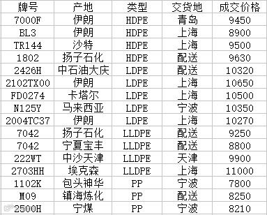 今日国内PE市场价格小幅波动,因石化个别高压出厂价格小幅上调,华东和华南部分高压高报50-100元/吨,其他窄幅波动,幅度在50元/吨左右。假期归来,市场交投氛围迷茫,缺乏指引,商家随行就市出货,高压因货少支撑,价格延续高位。整体来看,终端客户采购意向不高,随用随拿,观望为主。目前国内LLDPE主流报价在8750-9550元/吨。