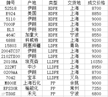 附表:我的塑料网今日部分主流牌号成交价格