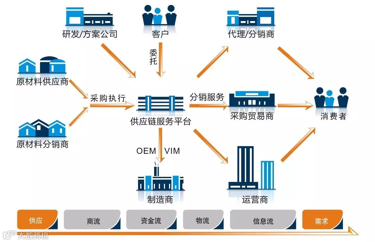 供应链条足够长的话,一般都扩展到C端了。例如在石化领域,从原油企业到上游石化企业,由石化企业生产出塑料原料,在经过层层代理商,最后到达塑料生产工厂,注塑、吹膜、拉丝等,并做成各种塑料制品,然后再经过各种代理商,在零售店销售,最终到达客户的手中。这是塑料企业完整的供应链。