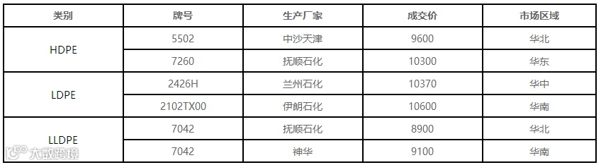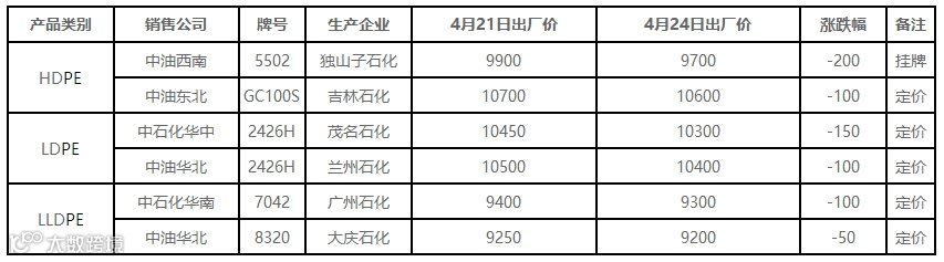 表4 4月24日国内PE出厂价格调整(单位:元/吨)