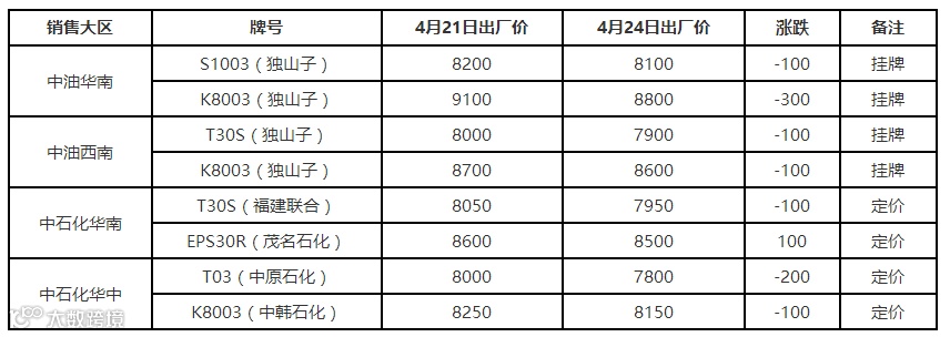 表5 4月24日国内PP出厂价格调整(单位:元/吨)