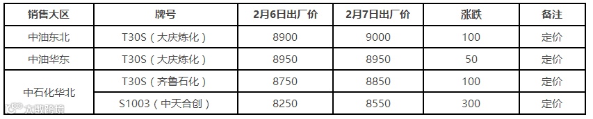 表5 2月7日国内PP出厂价格调整(单位:元/吨)