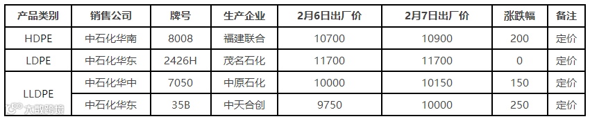 表4 2月7日国内PE出厂价格调整(单位:元/吨)