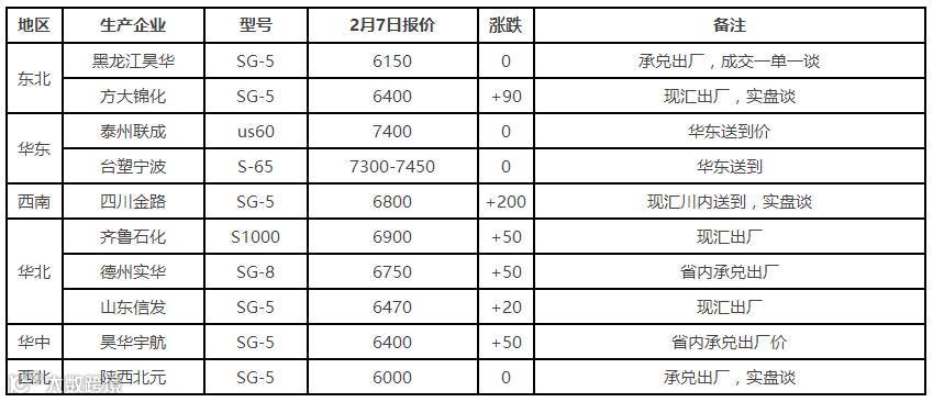 表6 2月7日国内PVC出厂价格调整(单位:元/吨)