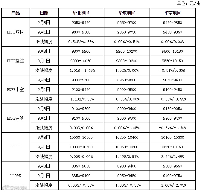 今日PE市场价格窄幅波动,华北个别线性略高50元/吨,华东和华南部分高压小涨100-150元/吨,其他盘整。线性期货高开上涨,部分石化上调出厂价,商家随行小幅跟涨,但下游抵触高价原料,导致出货不畅,原料价格涨幅受限。华北地区LLDPE价格在8850-9050元/吨,华东地区LLDPE价格在8900-9400元/吨,华南地区LLDPE价格在9300-9550元/吨。