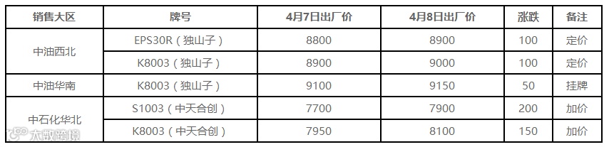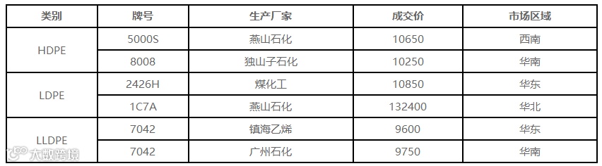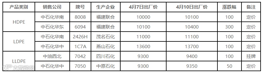 表4 4月10日国内PE出厂价格调整(单位:元/吨)
