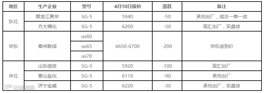表6 4月10日国内PVC出厂价格调整(单位:元/吨)