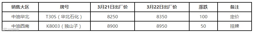 表5 3月22日国内PP出厂价格调整(单位:元/吨)