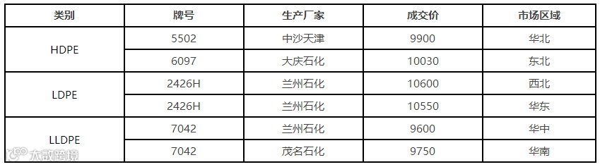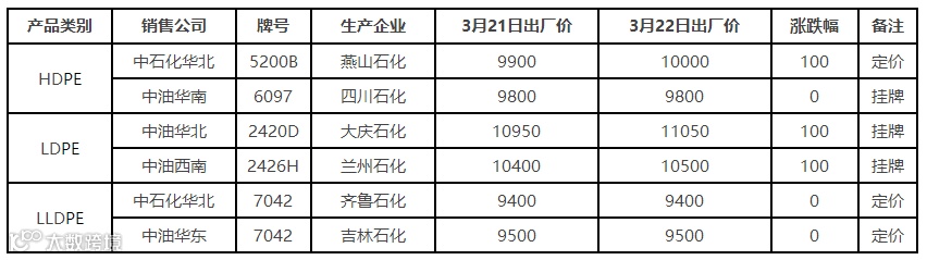表4 3月22日国内PE出厂价格调整(单位:元/吨)