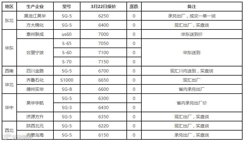 表6 3月22日国内PVC出厂价格调整(单位:元/吨)