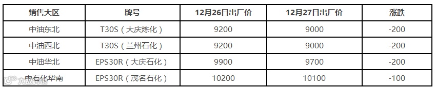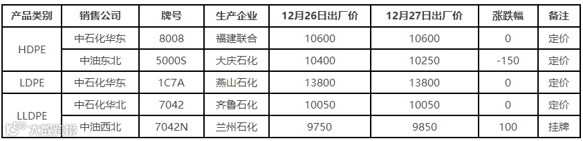 表4 12月27日国内PE出厂价格调整(单位:元/吨)