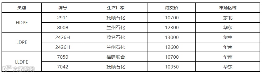 表1 12月20日我的塑料网PE市场成交价格(单位:元/吨)