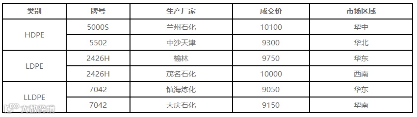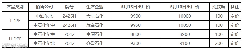 表4 5月16日国内PE出厂价格调整(单位:元/吨)